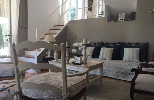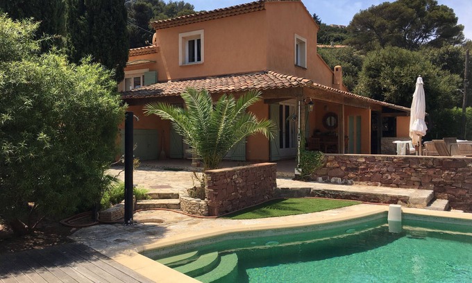 My house is a charming Provençal Mas of more than 140 m2 nicely decorated, on a raised ground of more than 600 m2. It is located exactly 71 m from the beach, 30 seconds on foot! It is very quiet because only accessible by a private road protected by a barrier where only the rare inhabitants of the massif can drive through. Beautiful Mediterranean trees frame the property, in the evening while having an aperitif on the terrace, you can hear the backwash of the waves .... In a revisited Provencal style, the property offers a small mosaic swimming pool with its teak deckchairs for sunbathe! A real fully equipped outdoor kitchen, with a plancha, allows you to cook outside while enjoying the outdoor warmth. Under the high meadow, there is a pleasant teak summer dining room, and on the large terrace, an outdoor living room protected from the sun by two large parasols, an outdoor shower and outdoor Vc complete the set. Inside the house, there are two beautiful comfortable bedrooms: a master suite which has its dressing room and its complete bathroom with shower, bath and toilet, another beautiful bedroom has large closets, a small shower room and toilet. The rooms are equipped with top-of-the-range 180x200 beds and quality white linen. A 3rd extra bedroom is possible in the living room on the mezzanine with a 140x200 bed, This is the TV lounge, be careful it is not a real bedroom because it is open to the rest of the house.