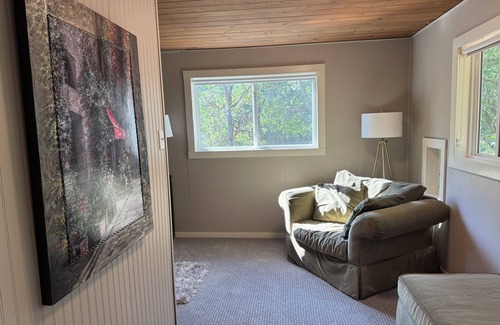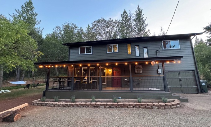 Relax and recreate with family and friends at this peaceful retreat in the woods. Built in 1940, this beautifully restored two-story home sits on 4 private acres just 6 minutes from the Rogue River and one hour from Crater Lake. Explore on-site trails for walking or nature study, or adventure farther into the forest on adjacent BLM lands. Play corn hole, horse-shoes or bocce ball and in the evening relax under the pines, gather around the fire-pit, feast on s'mores and sing campfire songs! Just 10 minutes from the community of Shady Cove and thirty minutes from Medford, this beautiful forest home includes a comfortable living room downstairs with flat screen tv, pellet stove, game room, full bathroom, laundry, fully stocked kitchen and dining room. A large chalkboard wall at the base of the stairs provides guests of all ages a chance to draw, write notes, and express their creativity! Lots of windows throughout bring nature inside without even stepping out the door! Upstairs you will find a cozy library nook with games and books, four comfortable bedrooms and another full bathroom. The master suite includes a cedar lined walk in closet and a private sitting room. Each upstairs room feels like being in a treehouse, as you gaze out at your own private forest! Two comfortable decks - one covered deck on the front of the house and another, smaller deck off the kitchen - are perfect for taking in the peaceful surroundings, enjoying a morning cup of coffee or late afternoon nap, or bbq'ing up some burgers for dinner!