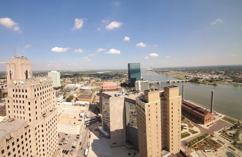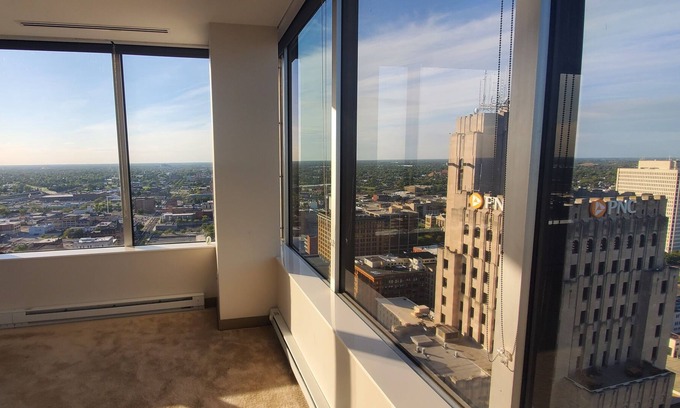 Enjoy your stay at this peaceful loft getaway downtown Toledo! Watch the sun-rise on the river from the living room or bask in the sunset from the panoramic views in the bedroom. This high-rise apartment has also has the best views of the city of Toledo as well as the downtown view of the Maumee River. It is not only right cross the street from the Promenade Park, The Huntington Center & SeaGate Convention Center, but a short walk or 2 minute drive from the Mud Hens Stadium. There are plenty restaurants & venues close by so you won't need to go far, to eat, party or just have a great time!