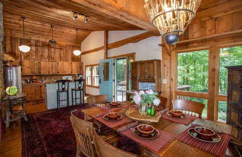 Azalea Hill is a rustic cabin conveniently located between Boone and Blowing Rock. This peaceful getaway nestled in the woods provides rustic charm with modern conveniences. The cozy living area, filled with warm wood details, a stone fireplace, and comfy seating surrounding an HDTV, provides views of Grandfather Mountain in the distance. The kitchen is equipped with stainless appliances, with seating for six at the main dining table and two more at the bar. The covered deck off the kitchen has Adirondack seating and a gas grill.
