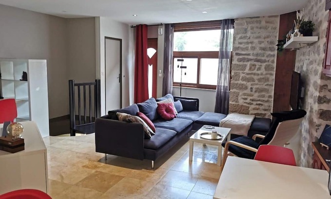 This charming and comfortable 65m² apartment is located on the ground floor with a private entrance. It features a spacious and pleasant living room with a large sofa, perfect for enjoying a cup of coffee, tea, or a glass of Burgundy wine after a day of exploring the local vineyards, while listening to music or watching TV.