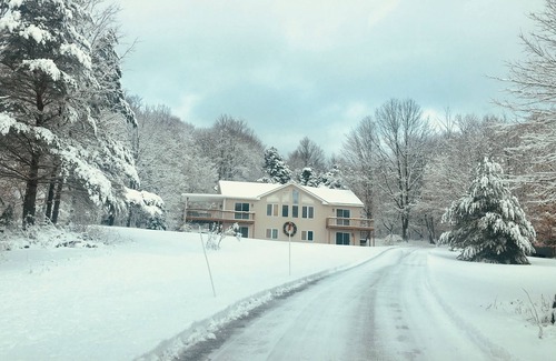 This charming 4 bedroom home is located on a private 3 acre hilltop retreat. Your space includes 4 bedrooms (1 king bed, 2 queens, 1 full and 2 twin beds), a living room, family room, dining room, full kitchen and 2 1/2 baths. There is also a deck located off of the dining room and a concrete patio access to the lower level. You have access to a grill located right off the deck for your grilling enjoyment.
