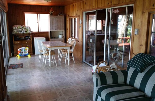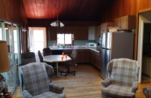 This 3BR/2Bath(showers only) home is 2 hours from Chicago, 30 minutes from South Bend, and 1 hour from Kalamazoo. MBR has a new King Pillowtop, second BR has 2 twins, third BR has a new Queen pillow top and a day bed with trundle, plus a queen Sleeper sofa in the Great Room. Great Room has 14' redwood plank cathedral ceiling; fireplace at one end, kitchen at the other. Hardwood flooring throughout. Sunporch (with new sofa and Loveseat) faces the lake, with wrap-around deck beyond that. New Split/Mini ac/heat system.