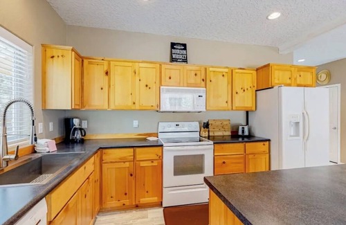 After spending your day adventuring relax on the backyard patio, enjoy the propane barbecue, and make some s'mores at the fire pit. Inside the 1800 square foot house is a kitchen ready to cook up your freshly caught fish, complete with rustic wooden cabinets and island seating for two. The dining area seats up to six people as well. The adjoining living area has comfortable sofas and a Roku smart TV to help everyone cozy up and really relax (you'll need to use your own login). Central AC will keep the house nice and cool while you’re away. The first floor also hosts a half bathroom and laundry area.