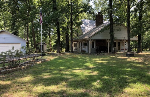 One mile to public launch on Lake Guntersville, this fully furnished 4 bedroom, 2 bath vacation retreat (sleeps 10) features a large covered patio surrounded by pastoral views and shaded lawn. Master loft with a king bed overlooks living room and includes a day bed, two spacious bedrooms downstairs feature another king bed, one queen bed; fourth bedroom features 3 twin beds. All rooms with views. Peaceful, well maintained, sparkling clean. Firepit, grills and outdoor seating, double detached locking garage located at the end of a private drive (near Mink Creek, 3.5 min from Goosepond Colony Golf course and marina). Perfect for fishermen, family vacations, golfer and hunters. Included: fully equipped kitchen, fridge and range, washer/dryer, coffee station, microwave, tv/cable, central heat/air, smoke detectors, exterior security lighting, NONSMOKING residence. No smoking or pets allowed. Free wifi. Ask us about event planning.