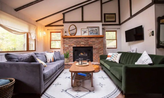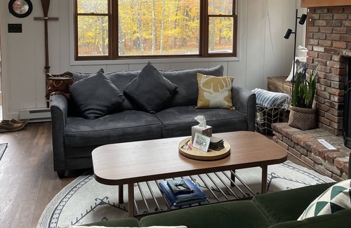 This one story cabin open plan living space features: two cozy sunlit couches by a beautiful fireplace, an eight seater dining table, fully equipped chef’s kitchen and appliances, two queen bedrooms, and a full bathroom. In the spring, summer and fall, enjoy our "three-season” sunroom perfect for reading, boardgames or as an additional sleeping space amongst the trees!. Outside, enjoy the wood burning fire-pit under festive carnival lighting, two hammocks, and picnic table seating.