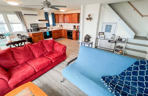 • Rooms: 1 Kitchen, 3 bedrooms (1 queen downstairs, 1 queen upstairs, 1 king upstairs with enclosed balcony/nook), 2 full bathrooms (1 downstairs, 1 upstairs), 1 living room (downstairs).