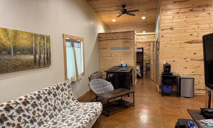 Your peaceful cabin retreat in Brainerd with 2 bedrooms awaits. Inside, you'll find a cozy bunk bed, two full beds, two queen besd, and a twin bed for a restful night's sleep. Enjoy the enchanting living room with a futon and a charming office space with a bunk bed. The cabin features heating, a washing machine, and WiFi for your convenience. With a refreshing shower in the bathroom, your stay will be nothing short of pleasant. Our place will help you feel at home while you're traveling in Brainerd.