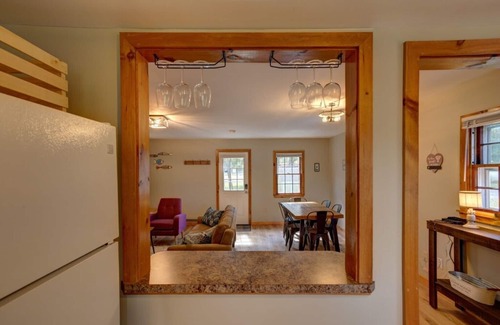 A large pass-through bar to the kitchen ensures all three areas are never cut off, so you won’t miss out on the fun no matter where you are; there are even two barstools, making it the perfect spot to enjoy a glass of wine or your morning coffee. The kitchen has been tastefully updated with new cabinetry and a lovely subway tile backsplash with an accent tile over the stove. Cooking will be convenient and even fun, as there is plenty of counter space and all of the cooking necessities—pots and pans, utensils and dinnerware, common spices and oils, a stove/oven, fridge/freezer, microwave, and even a dishwasher. Next to the fridge, there’s a convenient coffee station with a supply of coffee. Outside the kitchen, a massive deck awaits an evening barbeque—there’s a grill, a full propane tank, and a dining table.