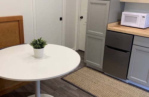 These bedrooms have a separate access to a shared large full bathroom with tub/shower. There is a kitchenette with a refrigerator, microwave and utility sink. There is a booth and table to accommodate guests in the 2 bedrooms.