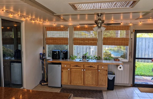 Pool loungers, hammock (set up upon request) and fire pit area offer additional space for relaxation. There is also an outdoor kitchenette with refrigerator, microwave, Ninja blender, Breville bagel toaster, George Forman grill, induction cook top, and Kuerig machine available for gentle use.