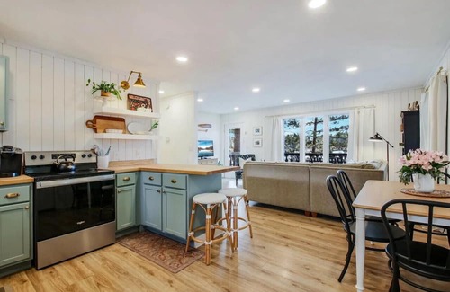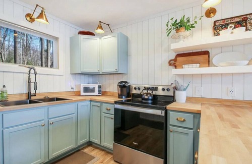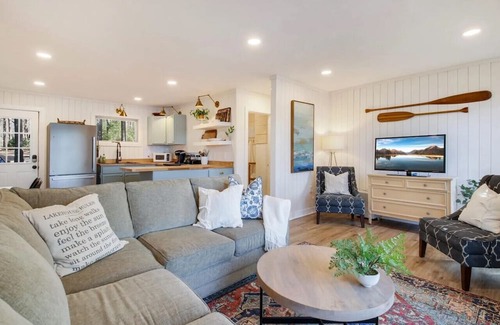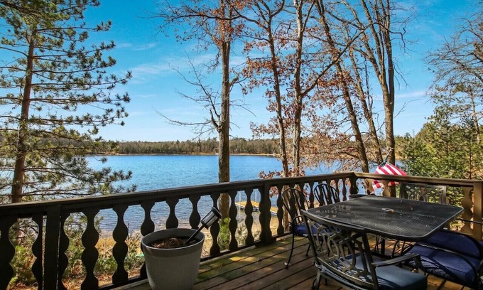 Cabin facilities include a modern kitchen with an electric stove and oven, full bathroom with a combination shower and bathtub, indoor dining area, screened-in porch with a dining area, a back deck with a grill overlooking the water, a dock and a swim raft. A canoe, two kayaks, life jackets, and swim toys are provided for fun on the water. There is a fire circle with many shops nearby to purchase dry firewood.