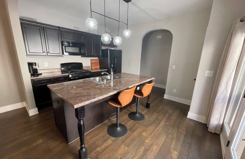 The open-concept living area provides a cozy space to unwind after a long day, with plush seating and a peaceful ambiance. The fully equipped kitchen makes meal prep easy, whether you need a quick breakfast before heading out or want to enjoy a home-cooked dinner after a busy day.