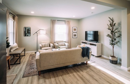 The room features a neutral-toned sofa with plush cushions and a soft throw—perfect for relaxing after a day exploring Evansville.