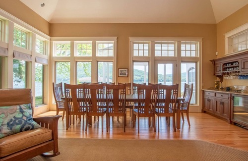 Throughout this home, emphasis is placed on the exceptional lake view, with lavish windows and glass doors in every room facing the water! To the left of the main entry is a stunning great room, with comfortable lounge furnishings and a dining table that seats 12 comfortably. A fieldstone gas fireplace extends floor to ceiling on the north wall and overhead sits an elegant chandelier. A wet bar in corner of the dining area offers a wine cooler and ample wine glasses to enjoy a great bottle of Finger Lakes wine.