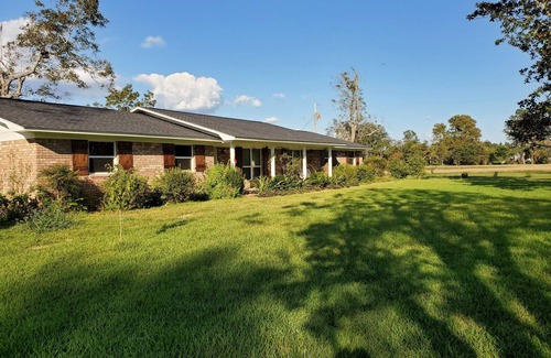 Our fairly rural peaceful home is newly remodeled with 2100 sq ft living area aside a picturesque pond (catch & release only, bream & large mouth bass) and pecan orchard remnants. (Rental only encompasses 1 acre of what is the yard around the house.) Once was our childhood home and now a second home. Fully furnished newly remodeled kitchen, living area, sitting room & front and back porches, 2.5 baths & 3 bedrooms with nearly all new bedding, sleeping up to eleven. Spacious and open great room with two separate sitting areas each with a 65" Roku TV, one with game console (Wii) and a great multitude of games or bring your own console and games for hookup. Easy access to Gulf Shores Beaches (30 min, 17 mi.) and OWA Amusement Waterpark & Entertainment Destination (10 min Foley, AL), Foley Sportsplex (18 mins), The Wharf Amphitheater (25 mins, Orange Beach) or even Florida Beaches (less than and hour). Relax on the front porch or back per your viewing choice of spacious front yard with flora or back patio with pecan tree backdrop, pasture and pond with soon to be added canoeing, all at your fingertips.