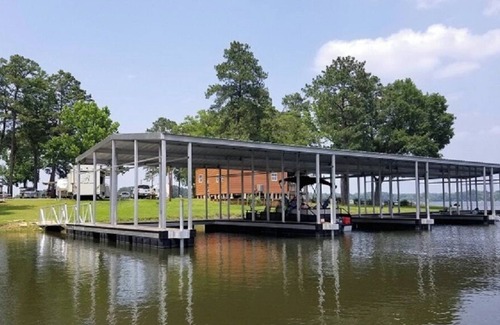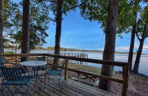 Lakefront Beach House with Nice Waterfront Deck. Marina, Convenience Store, Fish Cleaning Station, Fishing Pier, Coin Laundry, Boat Ramp all onsite. Waterfront 2 bedroom, 1 Queen Bed in each room, Twin Size Daybed w/Twin Trundle in LR, Full size Futon Sofa in LR, Room for Air Mattress, 2 Bathrooms. Fully furnished, Roku HDTVs throughout, Full kitchen with refrigerator, oven/stove, microwave, coffee maker, Kuerig, toaster, pots and pans, cooking utensils, dishes, glasses and silverware. Includes bed linens and towels. Wrap around porch with furnishings, a fire ring, and picnic table. All you need is your clothes and you're all set for a great getaway.