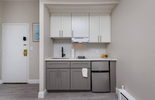 Everything you need and nothing you don't. Our motto is to provide fairly priced furnished apartments in great locations. The location will make up for the cramped space, but I think you'll find that once you settle in, you don't always need a ton of space! This unit is unique because it has a long hallway once you enter the apartment and the space is located in the back of the building so it should be super quiet.
