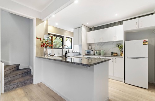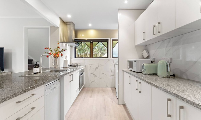 The home features an exceptional layout across two levels. On the ground floor, you’ll find a spacious and well-appointed kitchen with a breakfast bar that flows seamlessly into the dining and lounge areas. Our kitchen, decked with all essentials, awaits your culinary adventures. From appliances like toaster, kettle, stove, and oven, to cutlery and plates, we've got you covered.