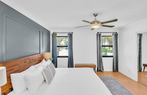 Originally built as a 3 bed/ 2 bath home, it has undergone renovations over the years to meet the changing needs of its owners. First, the garage was transformed into a second master bedroom, complete with a king-sized bed, and an en suite bathroom. And for even more room to spread out, a charming 1 bed/1 bath guest suite including a full kitchen and a spacious living room has been added to the back of the house, conveniently located by the pool. With its own entrance and beautiful view of the backyard, this space is the perfect spot for friends or family who want to have their own private oasis during their stay.