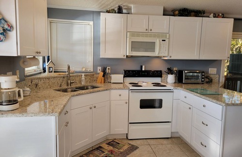 The tiled lanai is huge and is large enough to hang your hammock and still have enough room for dining and sitting area. The full kitchen has a spacious dining area as well, should you like to dine in a lot.