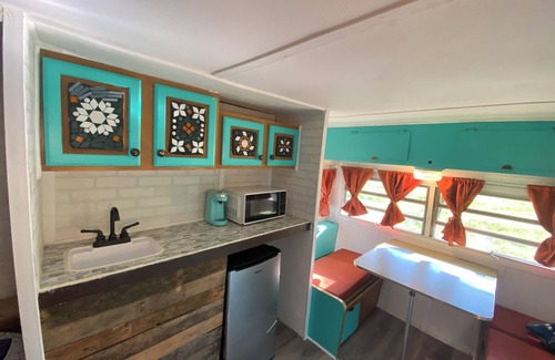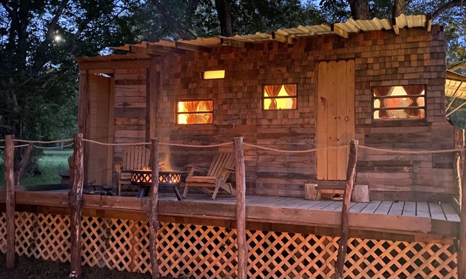Enjoy this cozy space on 15 acres of fields and trees on a Texas hobby farm. It’s located a few paces from a fresh water creek you can swim in! We turned a vintage RV into a fully functional cabin with fun features like an outdoor shower and a deck with a fireplace for a romantic getaway for two. There’s a water feature attached to the outside so you can listen to falling water while you sip wine in the evening and a cup of coffee in the morning.