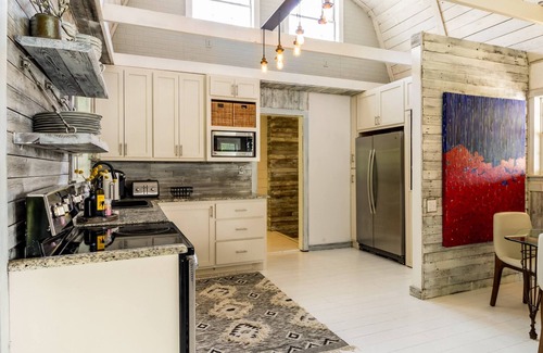 Pecan Tree House is a beautifully remodeled home that sits on over 5 acres with majestic oak trees, cypress, trees, and plenty of pecan trees. A large covered front and back porch frame the house offering picturesque views. Inside the home, find an open floor plan with a dine-in kitchen, an abundance of natural light, vaulted ceilings, with reclaimed wood, and barn wood wall accents. The cozy living space offers a great mix of texture and color: a rich leather sofa, fireplace, unique decor and colorful and fun artwork that are sure to bring smiles. The kitchen is fully stocked with stainless steel appliances and all that is needed to prepare family favorites. An added bonus washer and dryer are available for guests to use. The Master Bedroom has a large walk-in closet ,ensuite bathroom with clawfoot tub and shower. The King bed is dressed with luxurious bedding and a tufted leather headboard. A unique rustic tin ceiling frames the room and a private exterior entrance is the perfect place to stargaze with a glass of bubbly. The second bedroom hosts a queen bed with comfortable linens, a small sitting area perfect to relax with a good book. The ensuite bathroom has a walk-in glass shower and plenty of counter space. A private exterior entrance to the back patio is the perfect space to bird watch or enjoy a morning cup of coffee.