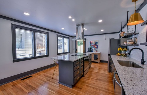 This gorgeously renovated 2 story house has 5 bedrooms, 4.5 bathrooms, and can hold up to 13 guests (only 10 adults). The porch has rocking chairs and a porch swing perfect for lounging out front with friends. The home is beautifully decorated with bold trimming that compliments the original charm of the home. There is plenty of space and seating throughout the house, so whether you want to hang out with family and play games or have a home-cooked meal, there is plenty of space for everyone! There are two full kitchens (1 upstairs, 1 downstairs). There is also a 12 cup drip coffee pot and single cup Keurig with a starter set of coffee, so the whole group can stay caffeinated! The house is also within walking distance to "The Strip" and Downtown Tuscaloosa, where you can find plenty of restaurants to eat, if you don't feel like using the beautiful kitchen!