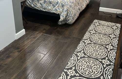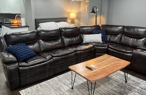 Enjoy a stylish experience at this centrally-located place. Has a full kitchenette with a burner, toaster oven, coffee pot, sink. The bathroom offers huge 2 person Jacuzzi tub, as well as a walk in shower! There is a dedicated work out space with a treadmill and some weights that guests are welcomed to use anytime. We hope you enjoy your stay here!