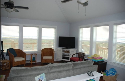This 3 bedroom/2 bath beach home has a large wrap around deck, an unobstructed view of the beach, and a wonderful crow's nest that lets you see for miles. There are queen beds in two of the bedrooms, a twin bed in the small bedroom, and a full size futon in the crow's nest. Plenty of covered parking, a washing machine and dryer, a small grill downstairs, an outside eating area, and all the beautiful sunrises you would want.