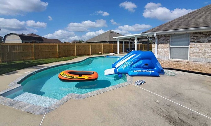 . Larger families and friends spacious hallways each bedroom is located in a corner of the house. Everyone is brought together by the open concept with a dining room, living room with theatre style chairs and seating, three of which recline. 4USB charging ports on the at the center of the sofa and end side. USB charging points in owners suites night stands. Smart lights that turn off after 15 minutes. Smart dimmers installed. Two big fridges. One in the garage and the other in the kitchen, as well as a mini fridge in the second master. Remotes to ceiling fans outside, with dimmer. The pool light is next to the outlet outside the master bedroom door. Salt water pool. Floaties for the pool. This house is in a quiet location in the middle of a Cul-de-sac with a 24ft covered patio with a family sized tabl and a propane fire pit for entertainment an extra seating table. We have a small charcoal grill (you must provide your own charcoal unless some were left by the previous guest). Clean up your mess after.