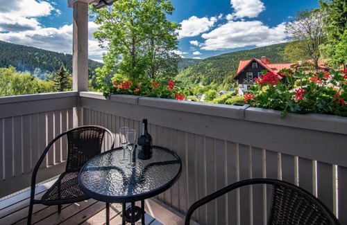 Pension Valon in Špindlerův Mlýn provides accommodations with a terrace and barbecue facilities. Complimentary Wifi is provided throughout the property and private parking is available on site. Outdoor seating is also available at the apartment. All self-catered units feature parquet floors and are equipped with a satellite flat-screen TV, a safety deposit box, an equipped kitchen with a dishwasher, and a private bathroom with shower. A toaster, a fridge, and stovetop are also available, as well as a coffee machine and a kettle. At the apartment complex, all units are allergy-free. A water park is available on-site, and both skiing and cycling can be enjoyed close to Pension Valon. Bus Stop Strážné is 9.4 miles from the accommodation. Pardubice Airport is 68 miles away.