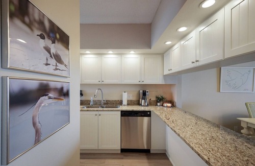 • A clean, bright kitchen with stainless steel appliances, updated off-white cabinetry, and granite countertops. The unit is equipped with everything you need to cook a great meal and have a relaxing evening at home.