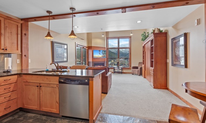 Top floor corner unit studio with fireplace and patio. Wonderful views of the mountains and gondola from unit.