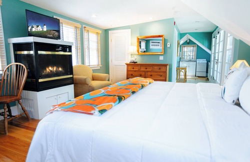 Ariel is a top-floor penthouse at our luxurious Provincetown hotel, offering an inviting balcony with views of the courtyard, town rooftops, and the Pilgrim Monument. The spacious 500-square-foot layout features French doors, skylights, and a sunlit dormer. Inside, you'll find a fully equipped kitchen, a cozy sitting area with a gas fireplace and TV, and a tranquil bathroom with a soaking tub and custom shower. This penthouse retreat includes a king-size bed, ideal for a relaxing, romantic getaway. Please note that this room is on the third floor with no elevator.