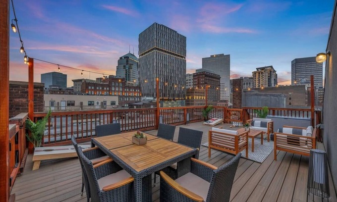 A delightful surprise awaits atop this loft: a rooftop deck where guests can gather for games and enjoy breathtaking views of the city skyline. Get ready for some friendly competition in rooftop cornhole! Bistro lights set the mood, casting a warm glow that enhances the magnificent atmosphere as you relax on the comfortable chairs after a day of adventure.