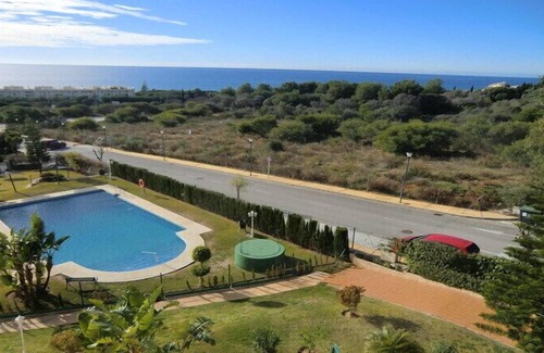 Located in a private complex with pool and children's playground. South facing, very bright and airy apartment with stunning sea views to Gibraltar. 2 terraces. One of them is a very large roof terrace. 2 bedrooms. One with a double bed, the other with 2 single beds. 2 Bathrooms. Well equipped kitchen. Garage space. Lift. Within walking distance to the beach, shops and bus stop. Quiet location in a pleasant environment.