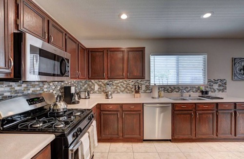 High speed internet WiFi, 2 55" flat screen TV's, upgraded mattresses, laundry room, fully equipped kitchen, beautiful backyard with Spa & BBQ grill, 2 car garage.