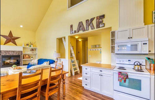 In addition to the cushy couch, two overstuffed chair and a charming window seat provide space for enjoying the evenings indoors. For entertainment, your group could immerse themselves in a movie on the large flat screen TV, pull out a board game, or just relax with some quiet time by the fireplace.