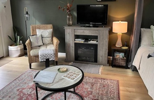 Our studio cabin has accommodations for 2 with a modern canopy bed, loveseat, electric fireplace , a private hot tub on our deck and firepit area . We have indoor and outdoor seating for meals and woodshelving milled right from our farm. We have WIFI, TV with firestick/ROKU channel. Our modern kitchen is equipped with everything you need to prepare a meal( double hot plate, air fryer with cook book, microwave, small refrigerator and coffee bar. We also supply a gas grill on our deck . No stove /oven provided