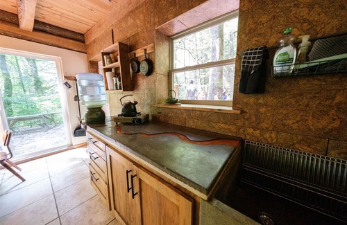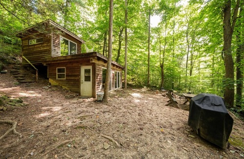 There is one electrical outlet in the cabin. For cooking, we provide a single butane burner inside and a propane grill outside. There is a gas log stove for heating and an A/C unit downstairs. Fire pit outside for your enjoyment! Water comes from a spring to a spigot outside the door. A heavy-duty cooler is provided for food storage.There is a 3 season outdoor shower not available in the winter months due to freezing temperatures. We provide cooking pots, pans, french press for coffee and pour-over drip, plates, silverware and cooking utensils, sheets, blankets, and towels. There are two lanterns, but headlamps are needed for hiking in and out and using the toilet after dark. Please read and share all this information with the people coming with you so you can BE PREPARED to glamp comfortably!