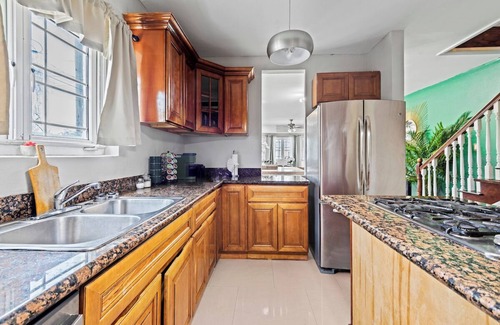 The fully equipped kitchen is a chef's delight, featuring an air fryer, Keurig coffee maker, waffle maker, blender, microwave oven, baker oven, double-door fridge, 4-burner stove top, and a double-sided sink. A half bathroom downstairs provides added convenience.