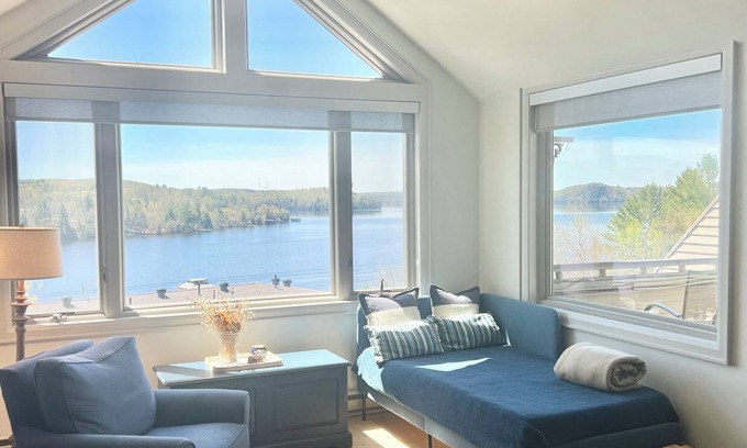 Cozy, cheerful winter destination, A fabulous family friendly vacation destination. Enjoy the downhill skiing 5 minutes away, Groomed Skating & Cross Country Ski Trails, fabulous Hiking Trails, & snowmobile trails. Conveniently located beside several Golf Courses & restaurants in Huntsville, fully equipped, open concept your private space. It's Peaceful, centrally located & 3 minutes to city amenities. Dockside access to beautiful Fairy Lk, Views are gorgeous. 2 work station areas.Reserve now!