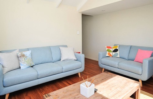 This holiday home has 2 bedrooms, 1 bathroom & an open plan living/dining/kitchen and a seperate living room. It has 2 outside decks with stunning views of the Harbour and beyond. The upstairs bedroom has a queen bed and downstairs a king bed. The kitchen has a new electric oven, fridge/freezer, microwave & all the kitchen utensils you should need for your bach stay. A barbeque is situated on-site for outside use on the deck.