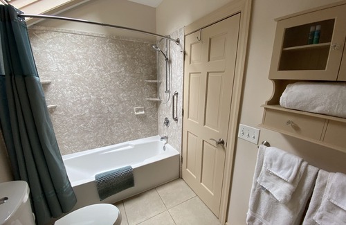The second floor stairwell ends at the smallest bedroom where you will find a single bed. The next room is larger and includes a double and single bed. The only bathroom on the second floor (a full bath) is newly remodeled. The last room is our master bedroom with a queen bed.