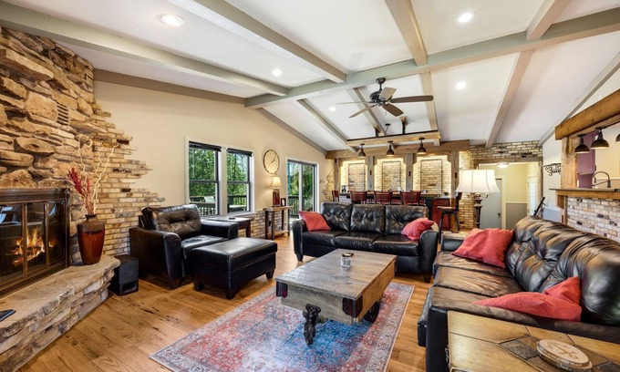 The family room and the kitchen is generally one large area which is perfect for families. It has a stone, floor-to-ceiling fireplace surrounded by a comfortable seating area. There is a huge bar height table in front of a backlit timber and cream city brick wall with a coffee bar and sink. Patio doors lead to a private, spacious deck with ample seating and a gas fire table and grill. The kitchen overlooking the family room is set up with everything you need to enjoy family meals at home if you choose. On the other side of the house, down the hall, is where you will find the three bedrooms. The master bedroom has a queen bed and a full bath with a walk-in shower and walk-in closet. The remaining 2 bedrooms each have a queen bed and a twin-XL bed along with a closet. Both bedrooms share the main bath at the end of the hall. It is a full bath with a shower over the tub. Additionally, the master bedroom walk in closet has been converted into a laundry area with washer and dryer for guests to use.