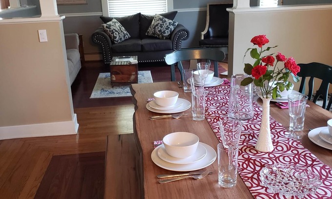 Elm St Charmer- Enjoy the detail and character of a 1910 farmhouse with high-end upgrades in this inviting 5 bed/3 bath Three Oaks home. Great for multiple families or groups coming to town for a wedding, with separate hang out spaces for adults and children. A convenient 6min walk to the downtown area, enjoy the shopping/dining/entertainment without needing to drive! Newly remodeled gourmet kitchen with quartz countertops and Viking stove, and modern air conditioning.