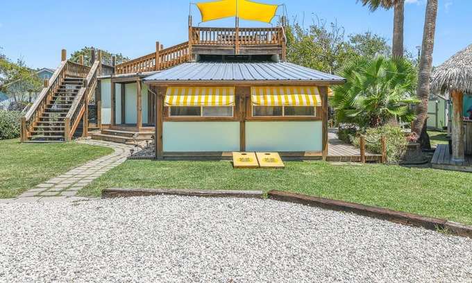 Book this amazing property perfect for large groups. Great place for Bachelorette parties, girl's trip, fishing trip or your family reunion. Great location walk to shopping, food, bars and fishing. Awesome outdoor area with a palapa bar, hot tub, outdoor shower, fire pit and the balcony with views of the water. The property consists of a 2-bedroom house and 3 super cute airstream trailers.