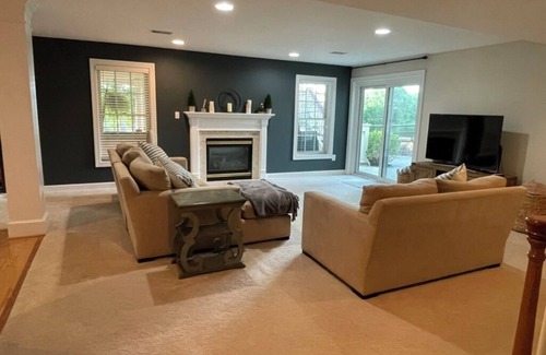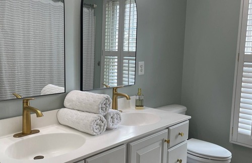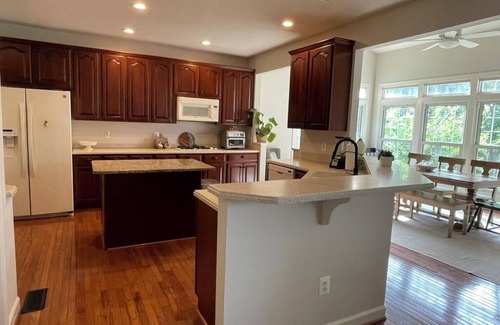 Waterfront home on Lake Manassas, directly across from Robert Trent Jones Golf Course! Fishing catch-and-release is permitted with an inexpensive, easy to get VA fishing license. Sleeps 8-9. Less than ONE mile driving distance to RTJ Golf Course. Unwind at this spacious, modern, and serene home. Beautiful screened-in porch (has fire table), large deck, and large lower level patio is the perfect place to relax, with plenty of seating for everyone! Essentially 2 living areas - Lower Level has a full bathroom, kitchenette, living room, fireplace, and Queen bedroom. Lower level bath has a jumbo-sized jetted tub, designed to be used after a long day of golf/activity. Enjoy a fun game of air hockey, foosball, or pick one of many board games to play. Located in a quiet cul-de-sac, this property has something for everyone. Direct backyard access to a 6.5 mile bike/walking trail, surrounded by the scenic views and sounds of nature. Bikes available with advanced notice. Just minutes from the Regal movie theater, Target, Wegmans, many top restaurants, and the entrance to Highway 66. Several breweries and wineries nearby, Approximately 30 miles to Washington DC.