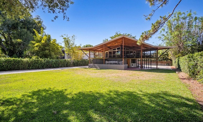 This "Vision-Aire" home was designed by renowned architect, Glenn Q. Johnson in 1954. The unusual triangular design affords a generous feeling of space, natural ventilation, and true indoor-outdoor living. The upper level includes a large open living space with abundant windows, soaring vaulted cedar ceilings, as well as outdoor dining and living areas. The downstairs offers a guest suite complete with living, dining, and a kitchenette. Newly added pool and putting green! Short walk to boat ramp and waterfront park. Walking friendly neighborhood. Less than a 10 minute drive to DTSP.